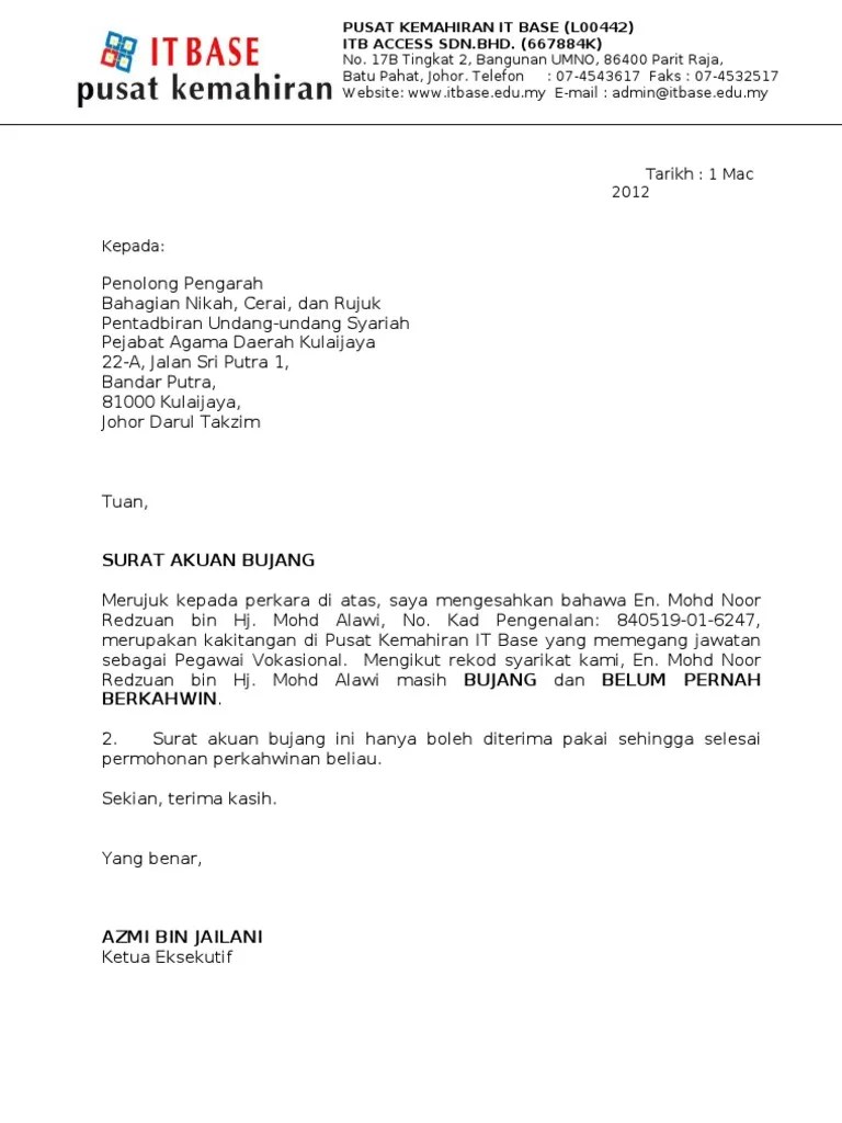 Surat akuan bujang dari ketua kampung kad pengenalan sijil kelahiran sijil kursus pra nikah kad pengenalan wali bagi pemohon perempuan sijil . Contoh surat pengesahan mastautin terengganu . Contoh surat rasmi akuan bujang frasmi. Borang am 80 lampiran 2 akuan berkanun negerinegara. Surat akuan bujang daripada majikan bagi pemohon yang ada majikanl surat akuan sumpah bujang yang diikrarkan di hadapan pesuruhjaya sumpah yang dimiliki pdf .